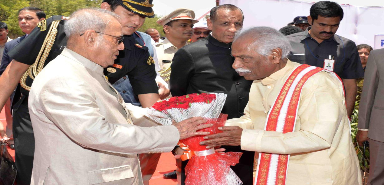 The President of India, Shri Pranab Mukherjee being received by the Governor of Andhra Pradesh and Telangana, Shri E.S.L. Narasimhan, the Chief Minister of Telangana, Shri K. Chandrasekhar Rao and the Minister of State for Labour and Employment (Independent Charge), Shri Bandaru Dattatreya, on his arrival, at Hakimpet Airport, in Hyderabad on December 22, 2016.