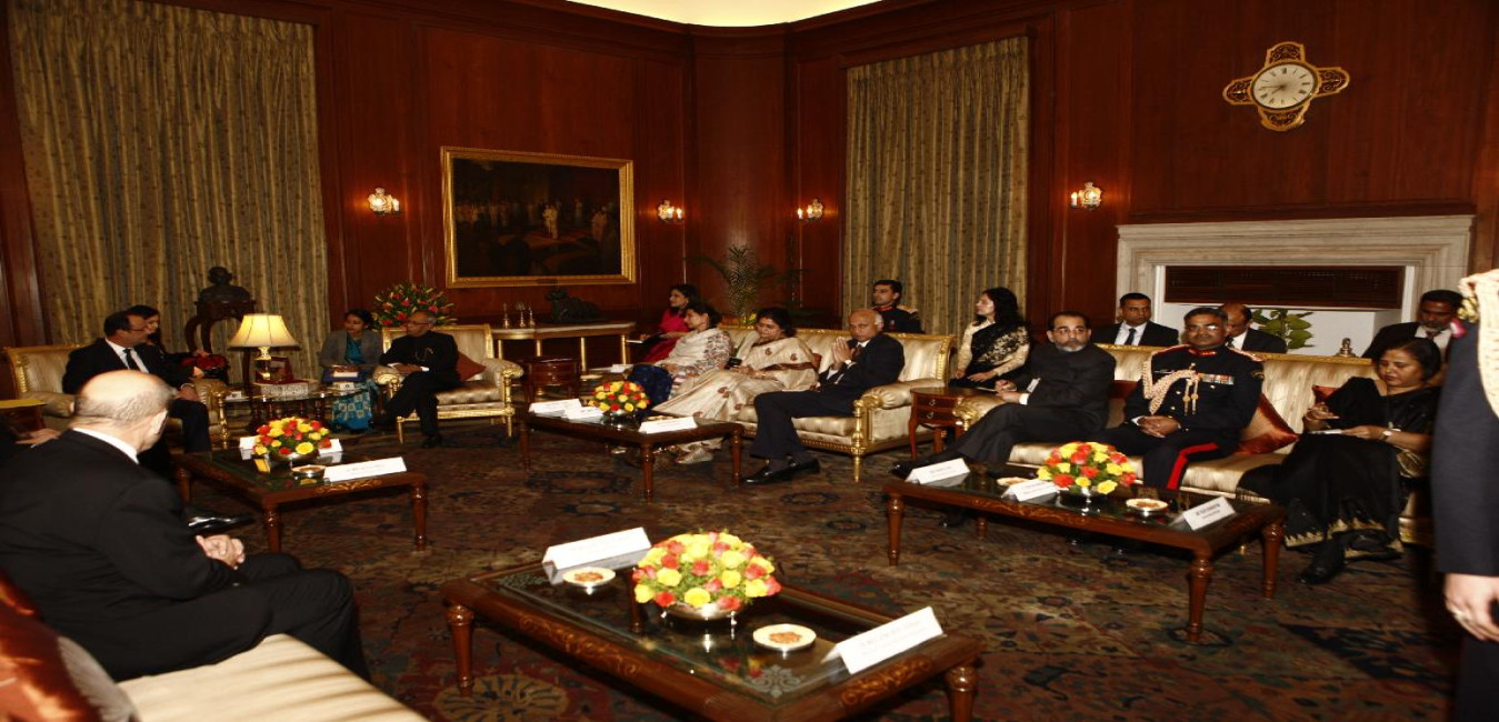 The President of India, Shri Pranab Mukherjee receives HE Mr Francois Hollande President of The Republic of France and Ms Valerie Trierweiler on February 14, 2013