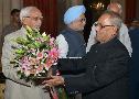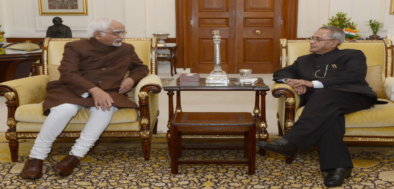 The President of India, Shri Pranab Mukherjee receiving Birthday Greeting from the Vice President of India, Shri Mohd Hamid Ansari at Rashtrapati Bhavan in New Delhi on Dec 11, 2013