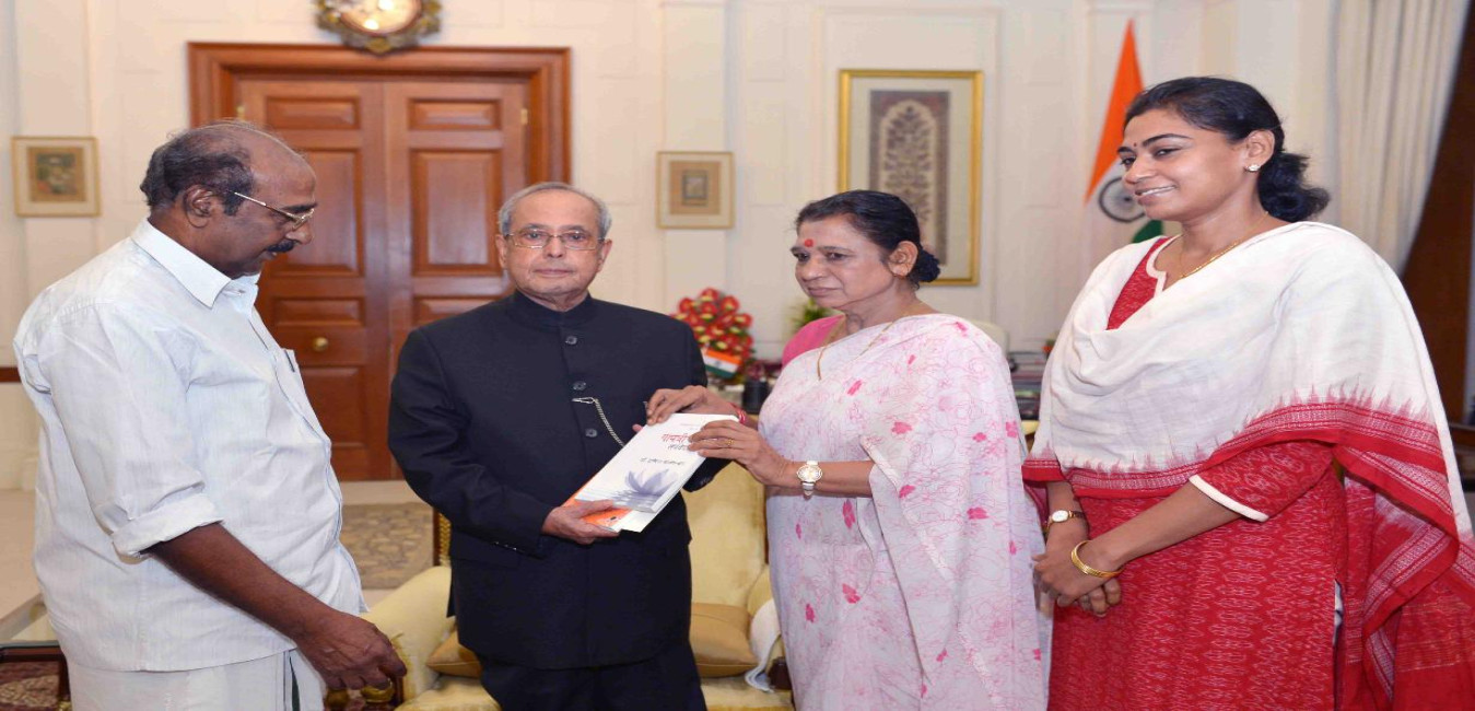 The President of India, Shri Pranab Mukherjee receiving a copy of the book ''Gayatri Mantra- Sarvavedsar'' from Dr. Indira Balachandran, author of the book alongwith Prof. G. Balachandran, former Chairman, Coir Board and Ms. I.B. Rani, at Rashtrapati Bhavan on September 01, 2016.