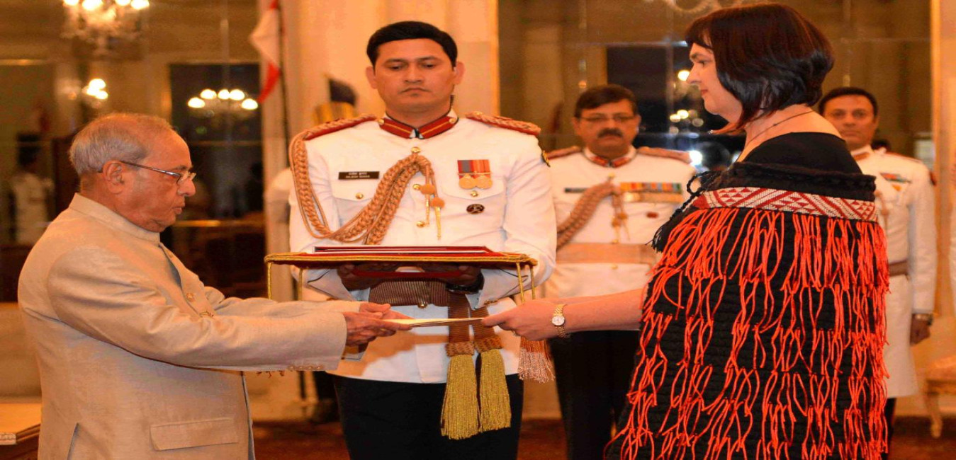 The High Commissioner of New Zealand, Her Excellency Ms. Joanna Kempskers presenting her credentials to the President of India, Shri Pranab Mukherjee, at Rashtrapati Bhavan on March 29, 2017.