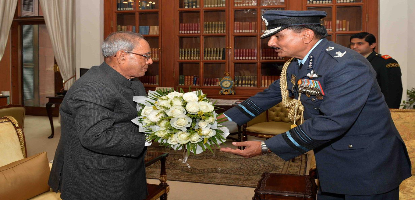 The President of India, Shri Pranab Mukherjee meeting with Air Marshal KS Gill, AOC-in-C, HQ CAC, Allahabad & Hony ADC to the President and Smt. Ranjeet Gill, at Rashtrapati Bhavan on December 10, 2015.