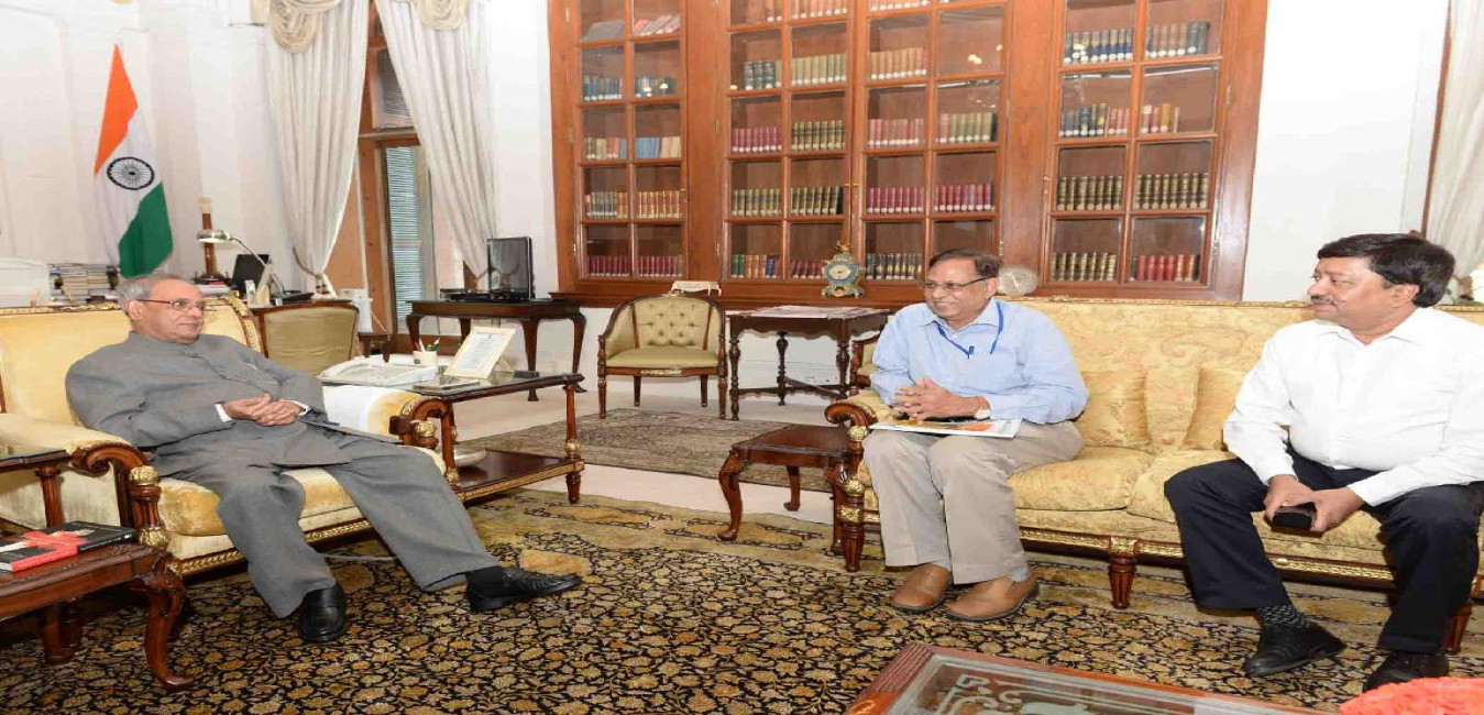 The President of India, Shri Pranab Mukherjee meeting with Shri Kailash Agrawal, Managing Director & Shri Prakash Dubey, Group Editor, Danik Bhaskar, at Rashtrapati Bhavan on July 22, 2016.