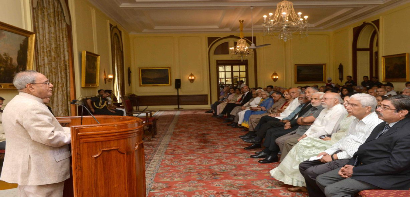 The President of India, Shri Pranab Mukherjee receiving the first copy of the book Building A Just World: Essays in honour of Muchkund Dubey from Dr. Kapila Vatsyayan, Trustee, India International Centre, at Rashtrapati Bhavan on September 21, 2015.