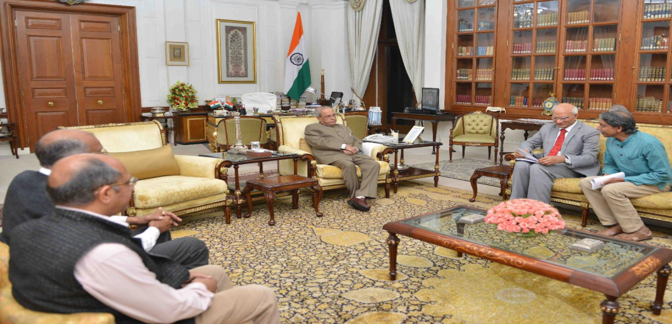 The President of India, Shri Pranab Mukherjee meeting with Prof. M. Jagadesh Kumar, Vice Chancellor, Jawaharlal Nehru University and Prof. Ved Prakash, Chairman, University Grants Commission, at Rashtrapati Bhavan on February 24, 2017.