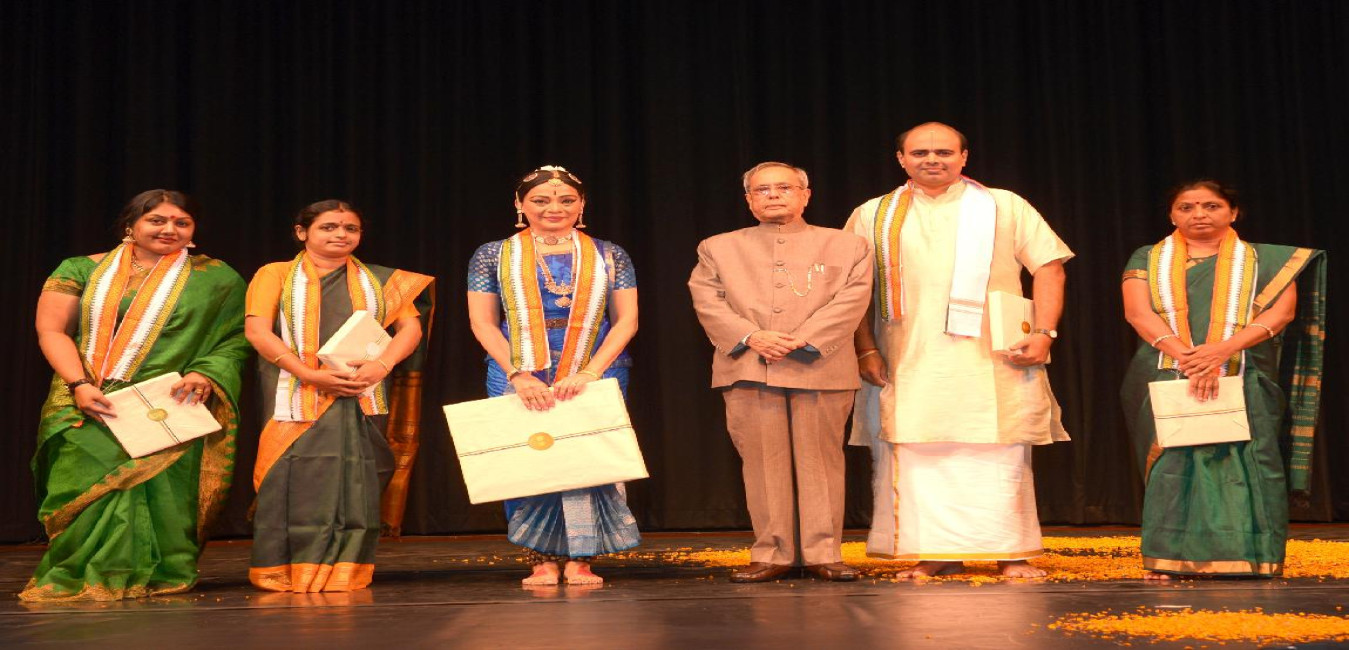 The President of India, Shri Pranab Mukherjee with the Artists after witnessing a Bharatanatyam Performance by Malavika Sarukkai and others at Rashtrapati Bhavan Auditorium in New Delhi on August 16, 2014