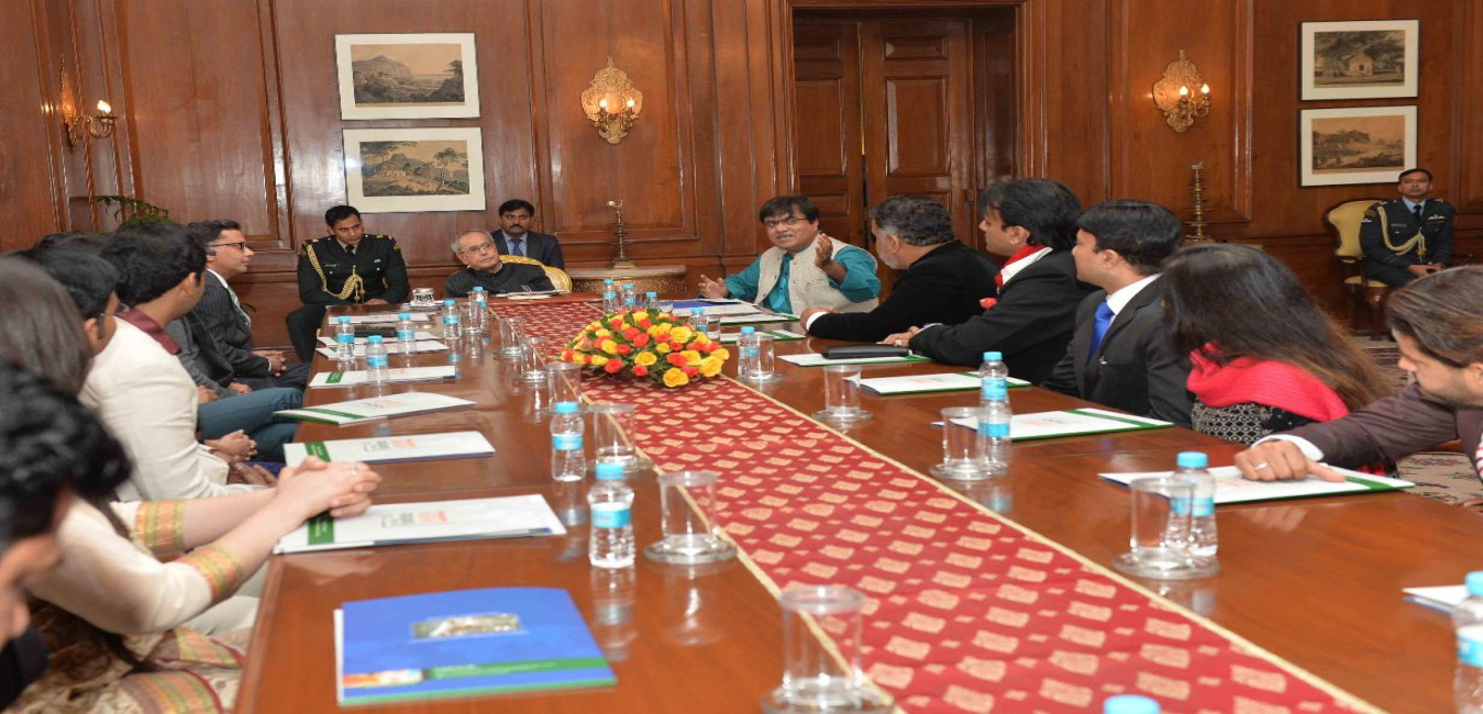 The President of India, Shri Pranab Mukherjee meeting with Shri Manish Mishra with others from Friends for Life, at Rashtrapati Bhavan on January 20, 2016.