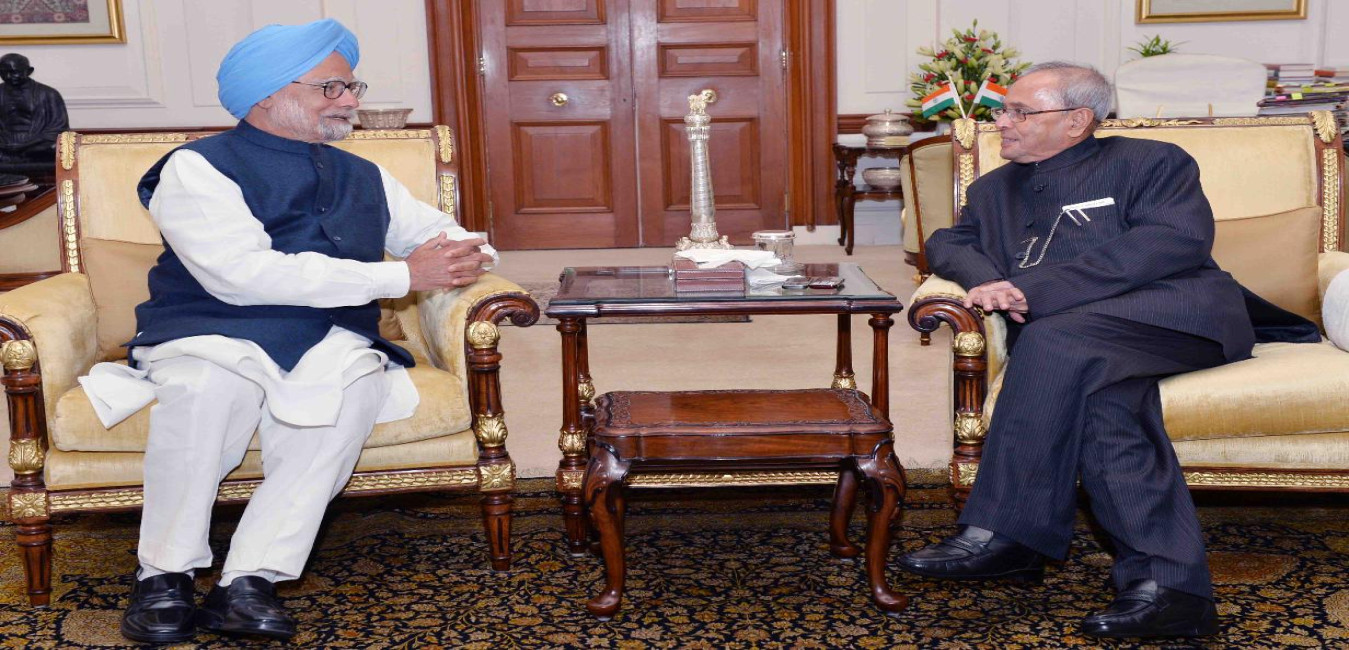 The Prime Minister, Dr Manmohan Singh calling on the President of India, Shri Pranab Mukherjee at Rashtrapati Bhavan in New Delhi on May 17, 2014