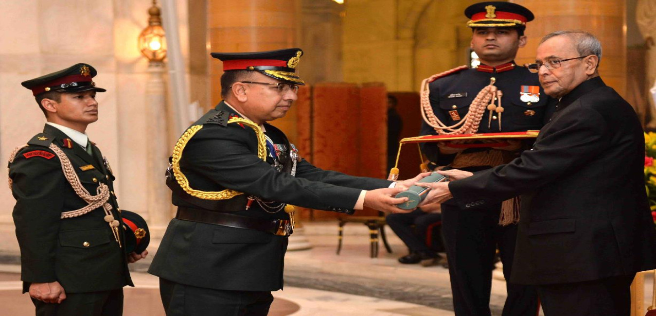 The President of India, Shri Pranab Mukherjee conferring the Honorary Rank of General of the Indian Army on General Rajendra Chhetri, Chief of the Army Staff, Napalese Army, at Rashtrapati Bhavan on February 03, 2016.