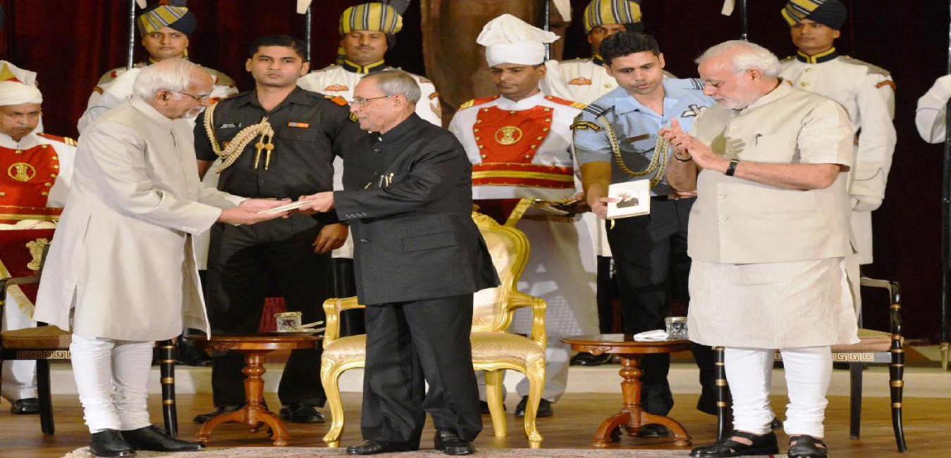 The President of India, Shri Pranab Mukherjee receiving the First Copy of the Thoughts and Reflections -a Compilation of Quotes of the President from the Vice President of India, Shri Hamid Ansari at Rashtrapati Bhavan in New Delhi on July 25, 2014