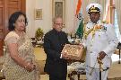 The President of India, Shri Pranab Mukherjee meeting with Vice Admiral P. Murugesan, Vice Chief of the Naval Staff alongwith his wife Smt. Medha Murugesan, at Rashtrapati Bhavan on May 16, 2016.