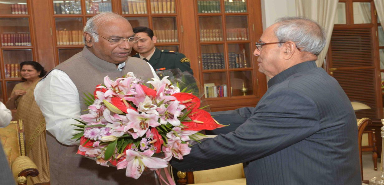 The President of India, Shri Pranab Mukherjee being greeted by Prof. P.J. Kurien, Dy. Chairman, Rajya Sabha, Shri Ghulam Nabi Azad, Leader of opposition in Rajya Sabha, Shri Mallikarjun Kharge, MP (LS) and Shri Rajiv Shukla, MP (RS), on the occasion of his 80th birthday, at Rashtrapati Bhavan on December 11, 2015 .