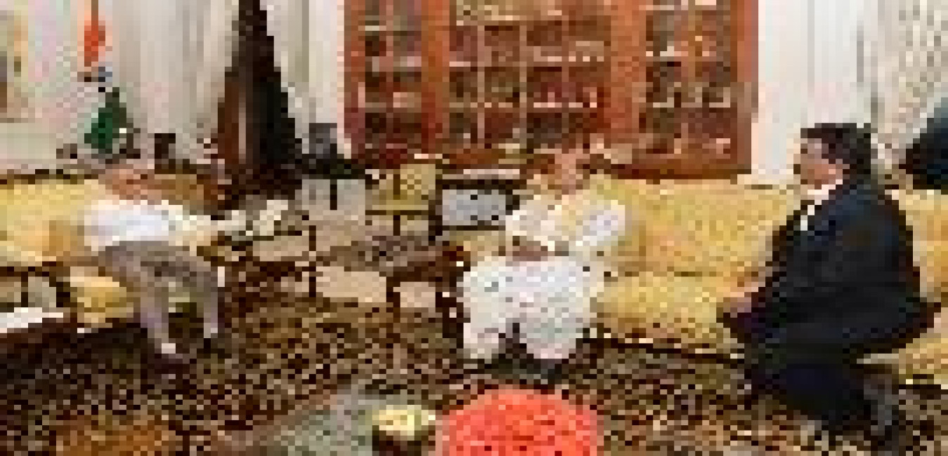The President of India, Shri Pranab Mukherjee meeting with Shri Pradip Bhattacharya, MP (RS) and Shri Kallol Dutta, Chairman & Managing Director, The Andrew Yule Group, Kolkata, at Rashtrapati Bhavan, in New Delhi on September 23, 2015.