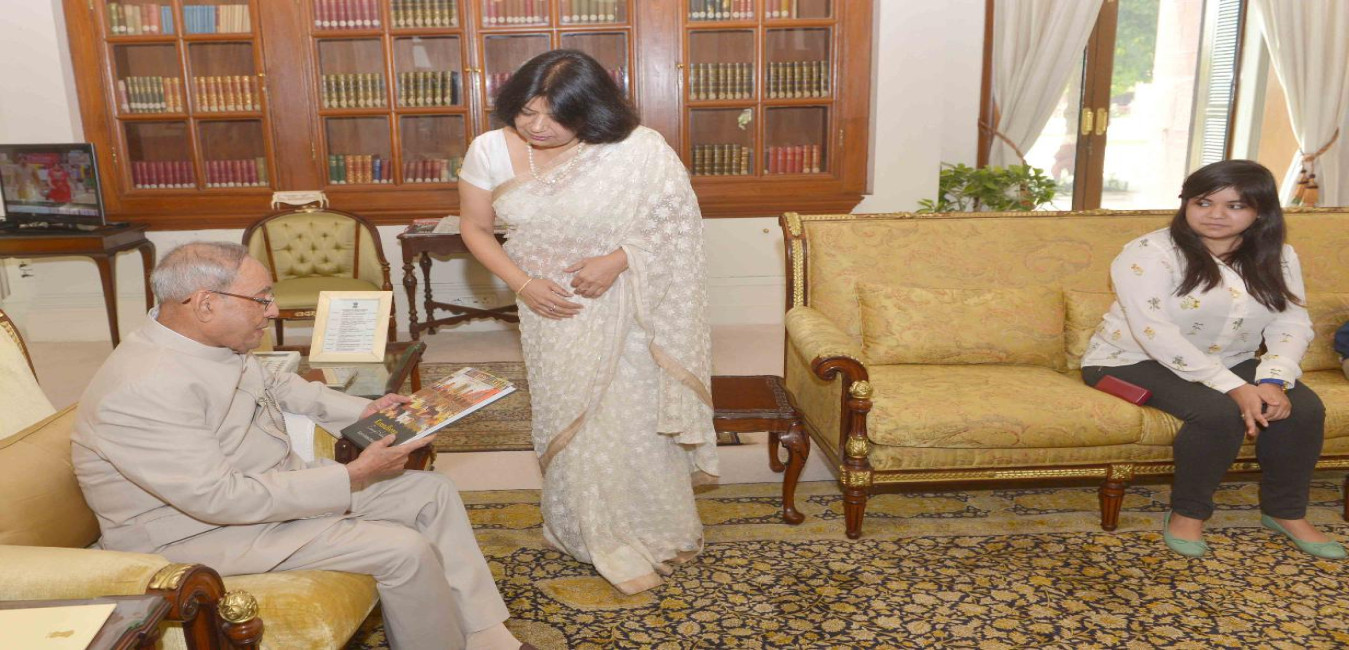 The President of India, Shri Pranab Mukherjee receiving a copy of the Book ''Kamadhenu: Cows of India'' from Ms. Rajni Sekhri Sibal, Additional Chief Secretary, Govt. of Haryana with others, at Rashtrapati Bhavan on May 30, 2016.