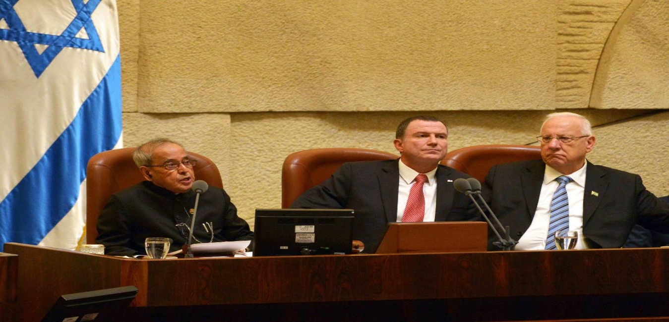 The President of India, Shri Pranab Mukherjee addressing the Members of Knesset (Israeli Parliament), at Jerusalem, during his State visit of Israel on October 14, 2015. The President of Israel, Mr. Reuven Rivlin, the Prime Minister of Israel, Mr. Benjamin Netanyahu and the Speaker of Knesset, Mr. Yuli-Yoel Edelstein are also seen.