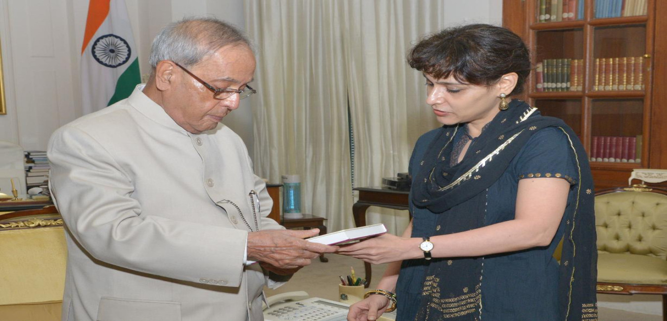 The Associate Professor of Cultural Anthropology, University of Texas, Dr. Ritu Gairola Khanduri presenting a copy of her book 'Caricaturing Culture in India: Cartoons and History in the Modern World' to the President of India, Shri Pranab Mukherjee, at Rashtrapati Bhavan, in New Delhi on July 29, 2015.