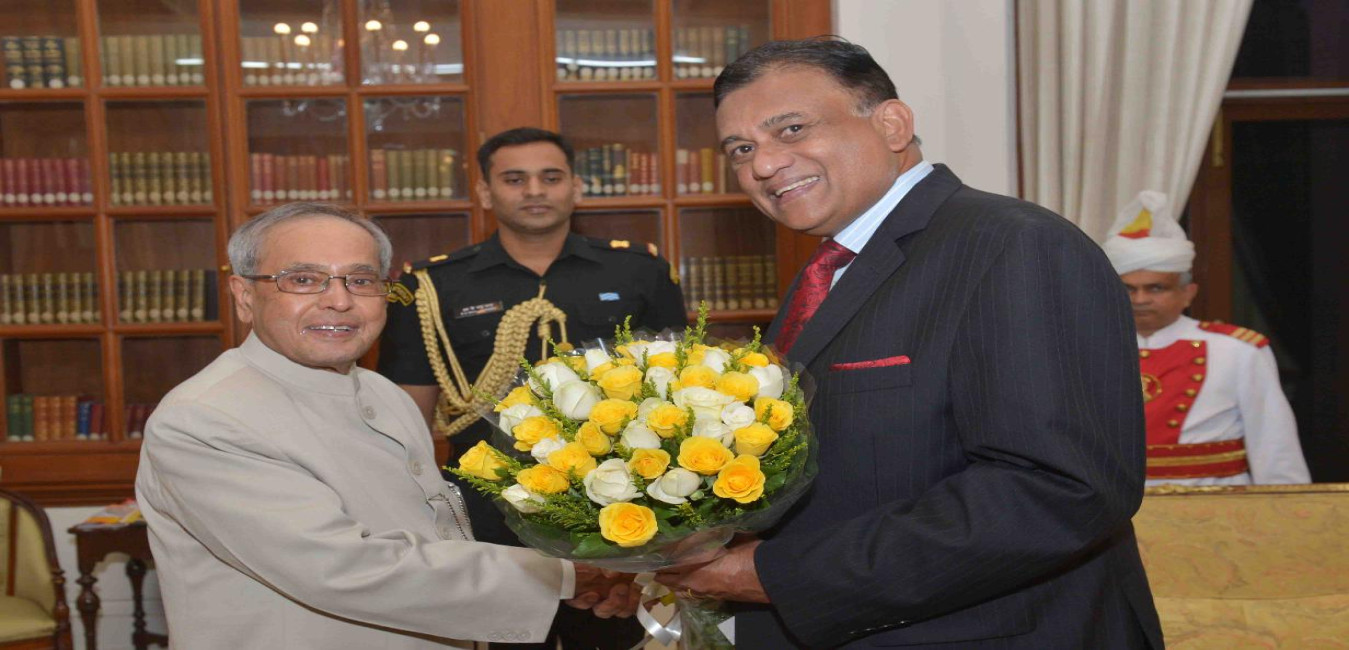 The President of India, Shri Pranab Mukherjee meeting with Mr. Rohith Bogollagama, former Foreign Minister of Sri Lanka, at Rashtrapati Bhavan, in New Delhi on October 26, 2015.