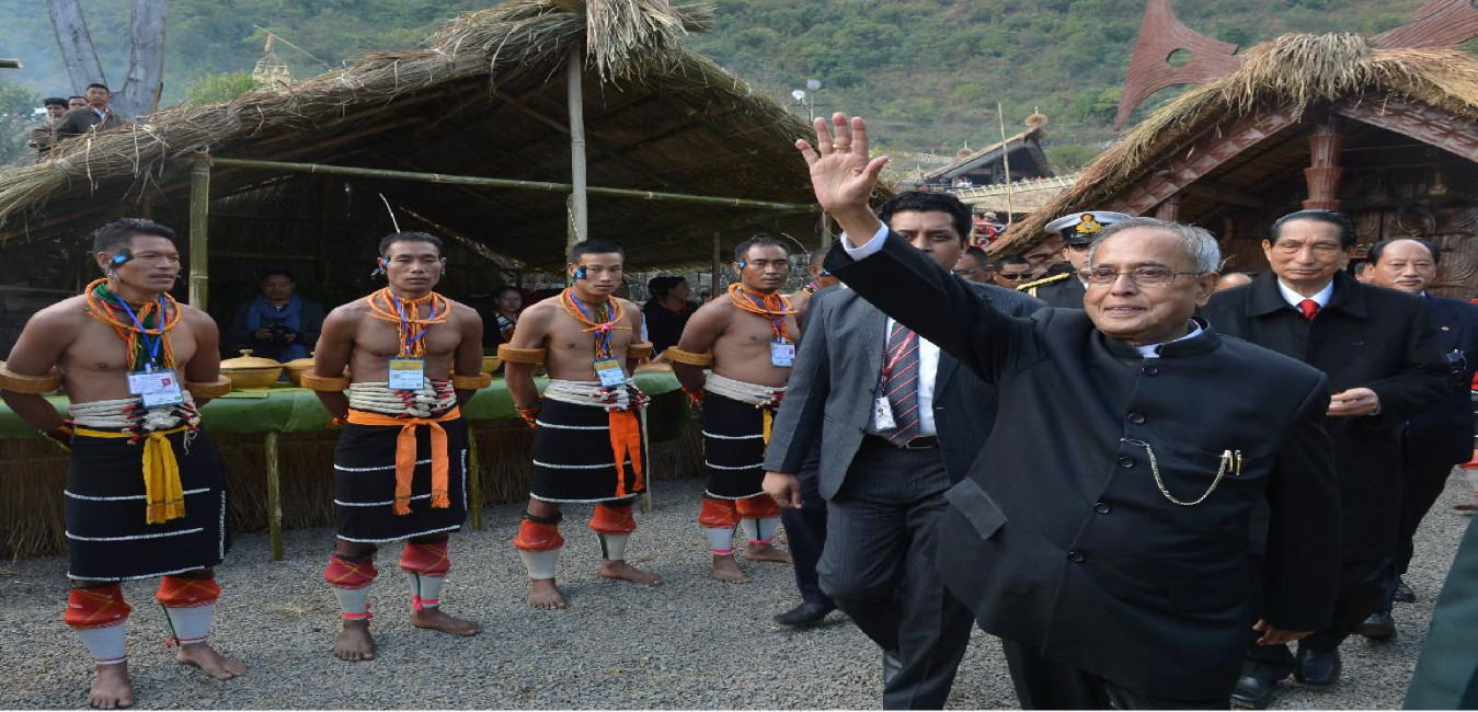 The President of India, Shri Pranab Mukherjee visiting the Pochury and Chakhesang Morung (Tribal Huts with Tribal People) at Window of Nagaland Gate in Kisama, Nagaland on Dec 01, 2013