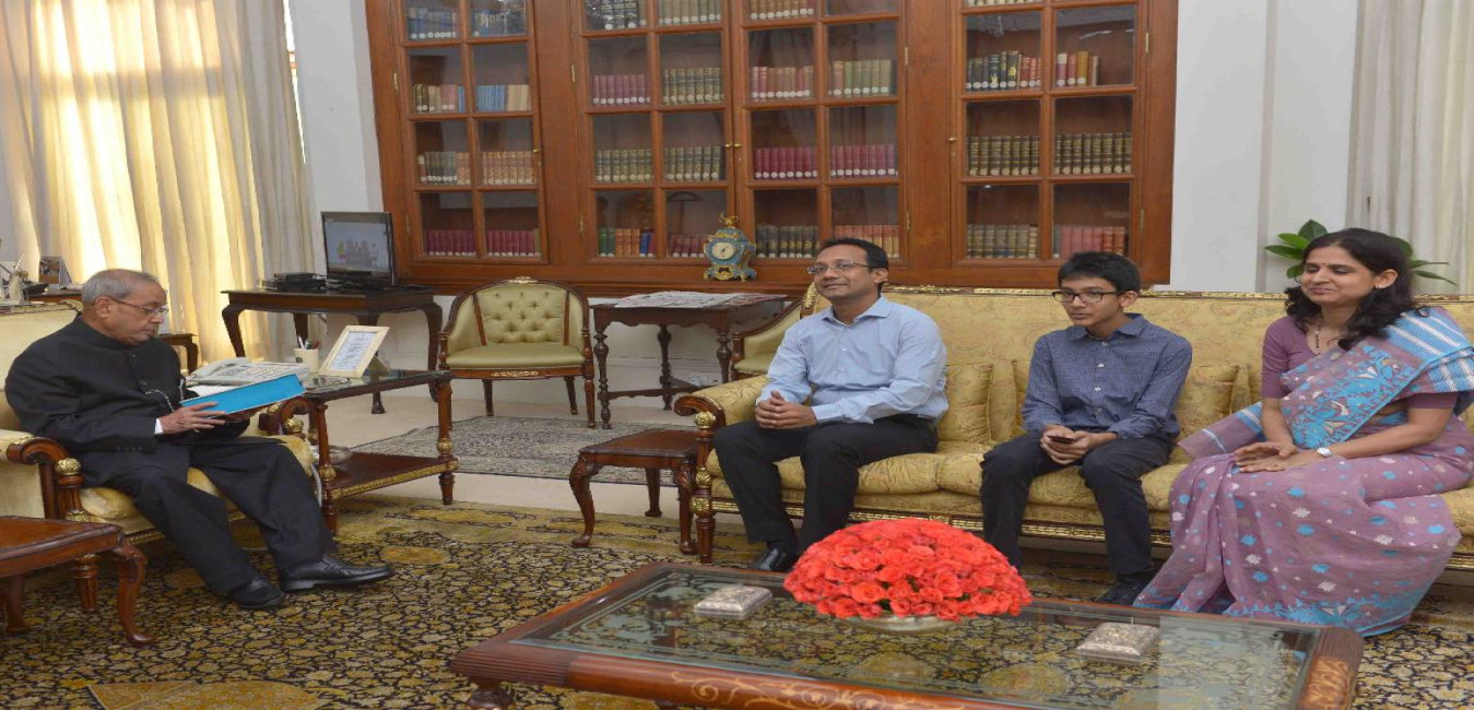The President of India, Shri Pranab Mukherjee meeting with Smt. & Shri Shakil Alam, OSD (S, R&R) alongwith their son Master Ayaan Alam, at Rashtrapati Bhavan on July 21, 2017.