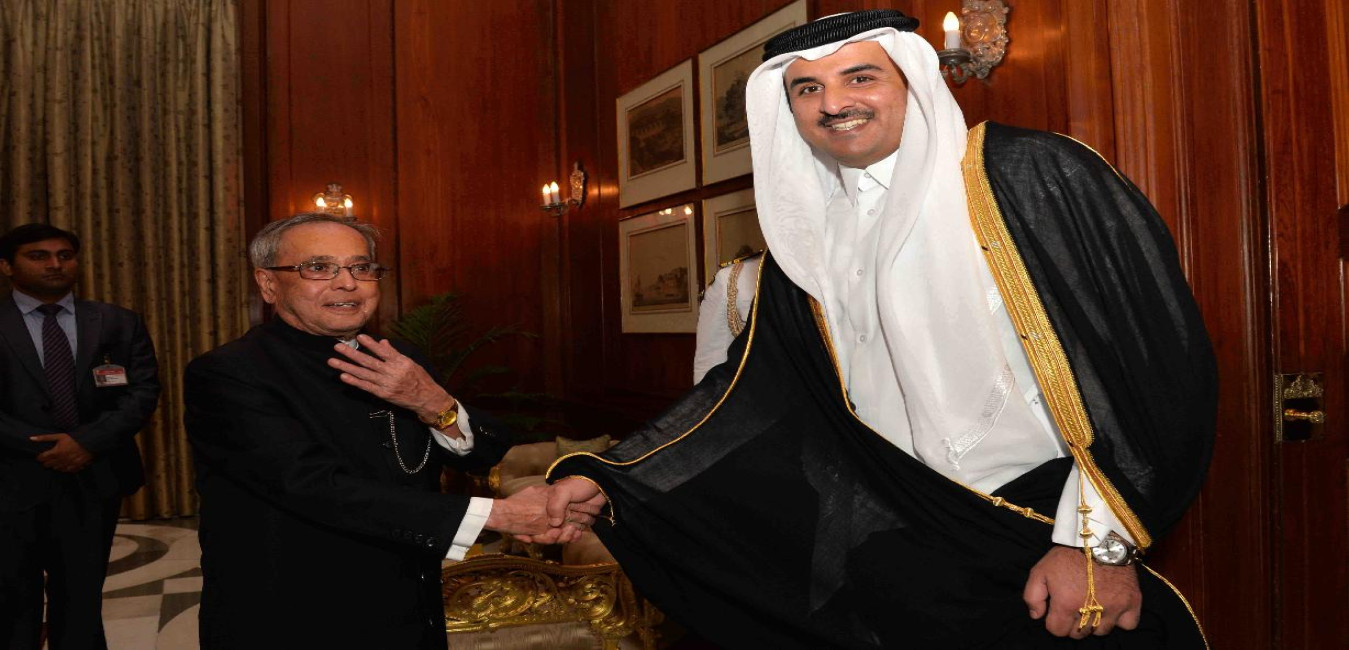 The Emir of the State of Qatar, His Highness Sheikh Tamim Bin Hamad Al-Thani calling on the President of India, Shri Pranab Mukherjee, at Rashtrapati Bhavan, in New Delhi on March 25, 2015.