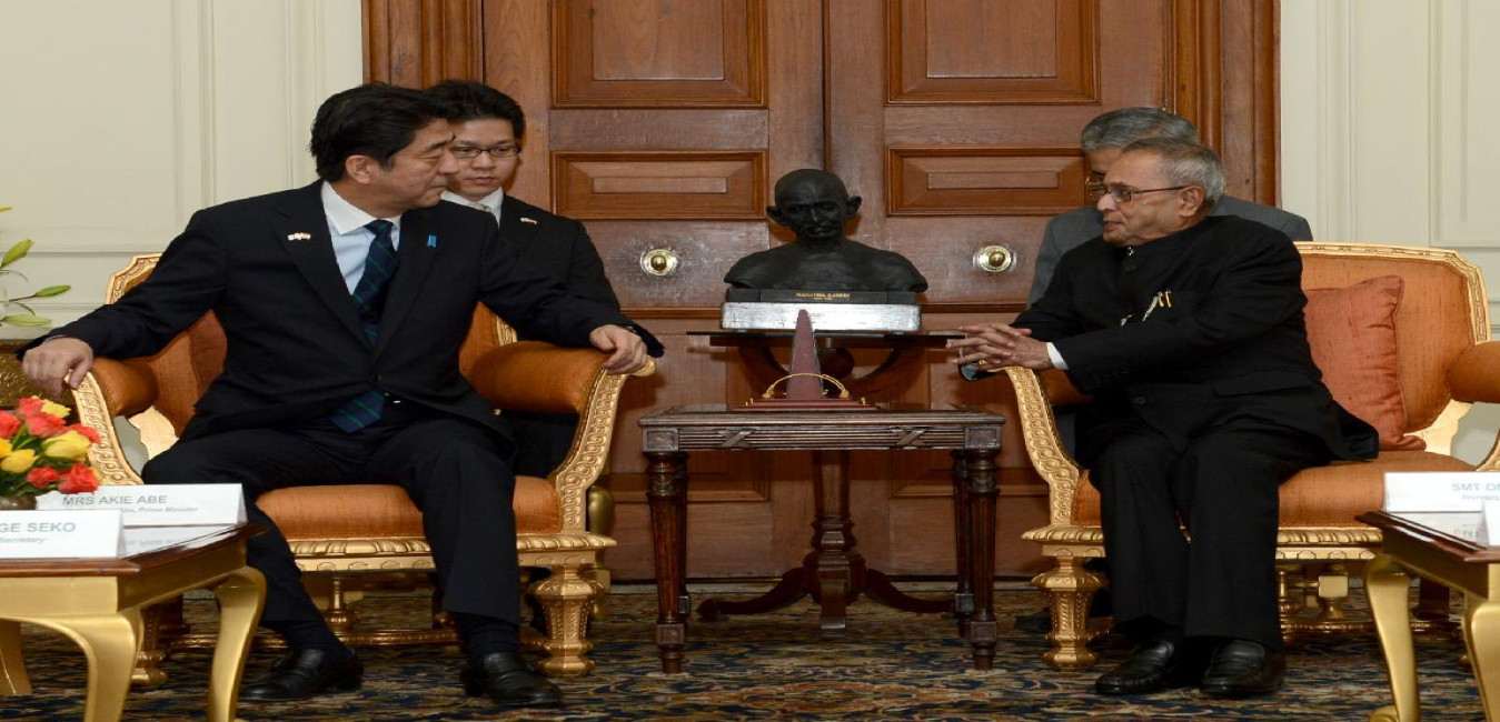 The Prime Minister of Japan, H.E. Mr. Shinzo Abe calling on the President of India, Shri Pranab Mukherjee, at Rashtrapati Bhavan on December 12, 2015.