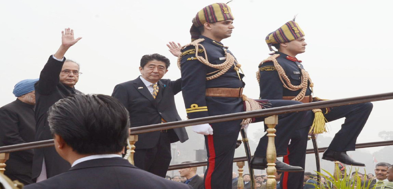 The President of India, Shri Pranab Mukherjee along with Distinguished Guest, the Prime Minister of Japan, HE Mr Shinzo Abe during the Republic Day Parade at Rajpath in New Delhi on Jan 26, 2014