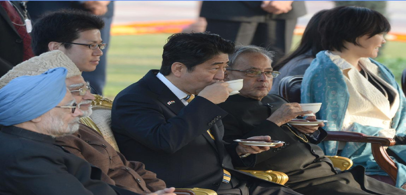 The President of India, Shri Pranab Mukherjee along with Distinguished Guest, the Prime Minister of Japan, HE Mr Shinzo Abe during the Reception on the occasion of 65th Republic Day Celebration on the lawns of the Mughal Garden at Rashtrapati Bhavan in New Delhi on Jan 26, 2014