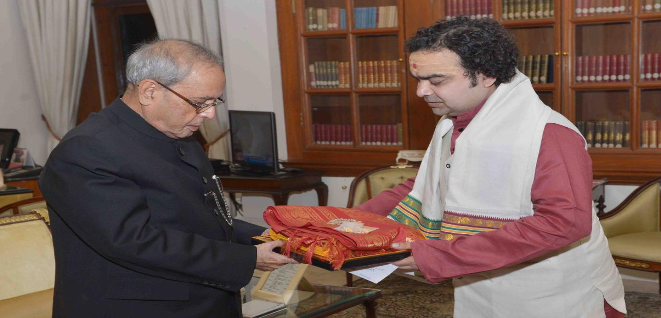 The President of India, Shri Pranab Mukherjee meeting with Dr. Shrikant Mishra, Head Priest, Kashi Vishwanath Temple, Varanasi, at Rashtrapati Bhavan on January 19, 2016.