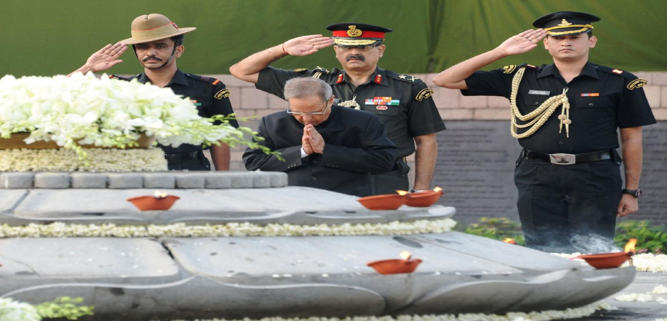 The President of India, Shri Pranab Mukherjee paying floral tributes at the Samadhi of the Former Prime Minister of India, Late Smt Indira Gandhi to Commemorate on her 97th Birth Anniversary at Shakti Sthal in New Delhi on Nov 19, 2014
