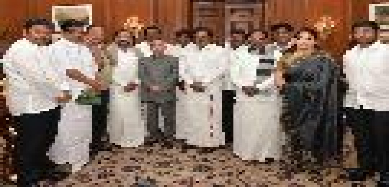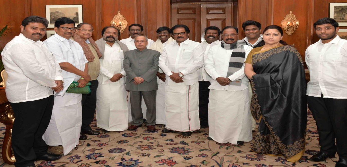 The President of India, Shri Pranab Mukherjee meeting with Shri Su. Thirunavukkarasar, former Union Minister & President, Tamil Nadu Congress Committee with others, at Rashtrapati Bhavan on January 23, 2017.