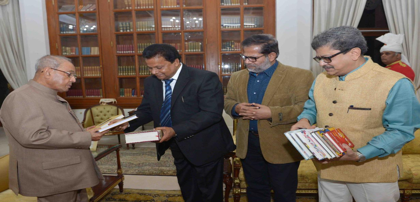 The President of India, Shri Pranab Mukherjee meeting with Shri Sudhangshu Sekhar Dey, President, Publishers & Booksellers Guild with others, at Rashtrapati Bhavan on January 05, 2017.