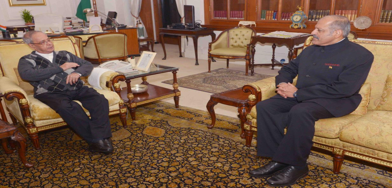 The President of India, Shri Pranab Mukherjee meeting with Shri Sujan R. Chinioy, Ambassador of India to Japan, at Rashtrapati Bhavan on December 14, 2015.