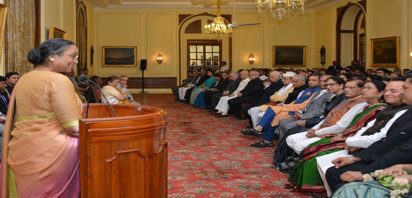 The President of India, Shri Pranab Mukherjee receiving the first copy of the book 'Indian Parliamentary Diplomacy - Speaker's Perspective' of Smt Meira Kumar, former speaker, Lok Sabha, at Rashtrapati Bhavan, in New Delhi on March 19, 2015.