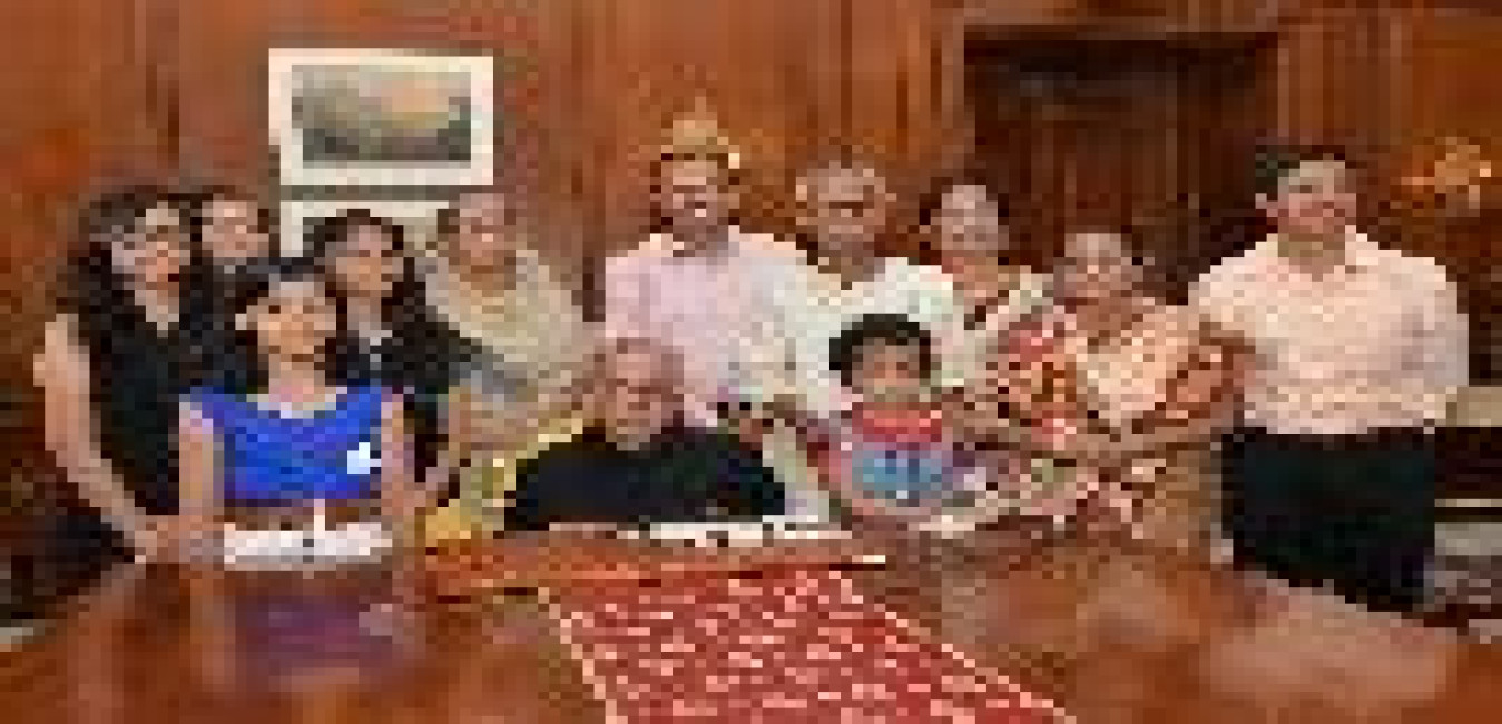 The President of India, Shri Pranab Mukherjee meeting with Dr. Sushil Bhattacharya, President, Nikhil Banga Sahitya Sammelan, West Bengal Branch and family and receiving a book 'Ananya Byaktiyar Adhikari Rashtrapati Pranab Mukopadhyay , at Rashtrapati Bhavan, in New Delhi on October 05, 2015.