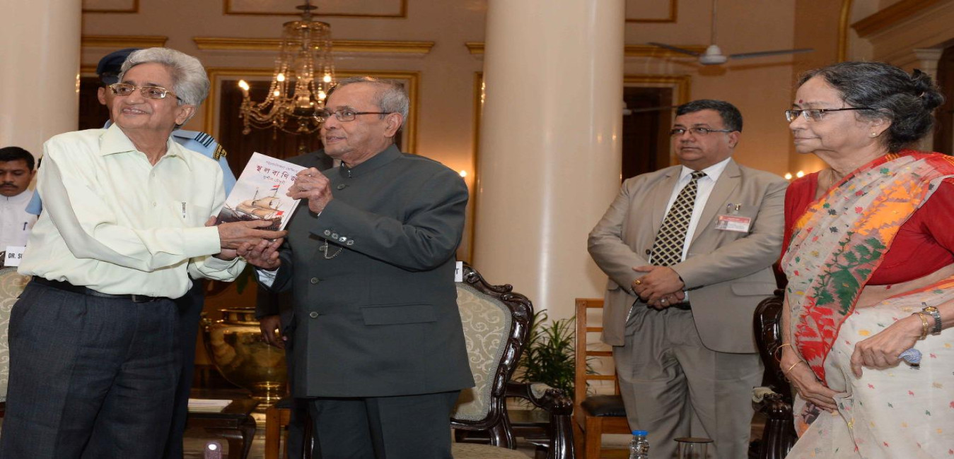 The President of India, Shri Pranab Mukherjee receiving the books Jnan, A-Jnan O Bijnan: Popper-er Jnantatta and Samudra Banijjer Prekshite Sthala Banijjya, Bharat Mahasagar Anchal, 1500-1800 from Dr. Sushil Chaudhury and Dr. (Smt.) Mahasweta Chaudhury, at Kolkata, in West Bengal on May 19, 2017.