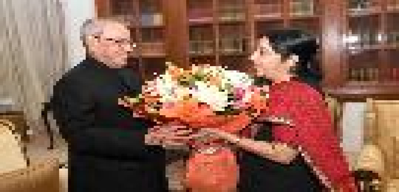 The President of India, Shri Pranab Mukherjee being greeted by the Minister of Foreign Affairs, Smt. Sushma Swaraj, on the occasion of his 80th birthday, at Rashtrapati Bhavan on December 11, 2015 .