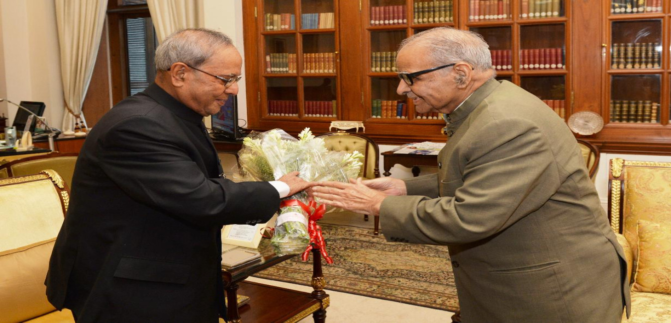 The President of India, Shri Pranab Mukherjee being presented 50 volumes of Tagore's writings in Hindi, published by the Sasta Sahitya Mandal by the former Governor of Karnataka & Kerala, Shri TN Chaturvedi and others from Sasta Sahitya Mandal, at Rashtrapati Bhavan, in New Delhi on July 21, 2015.