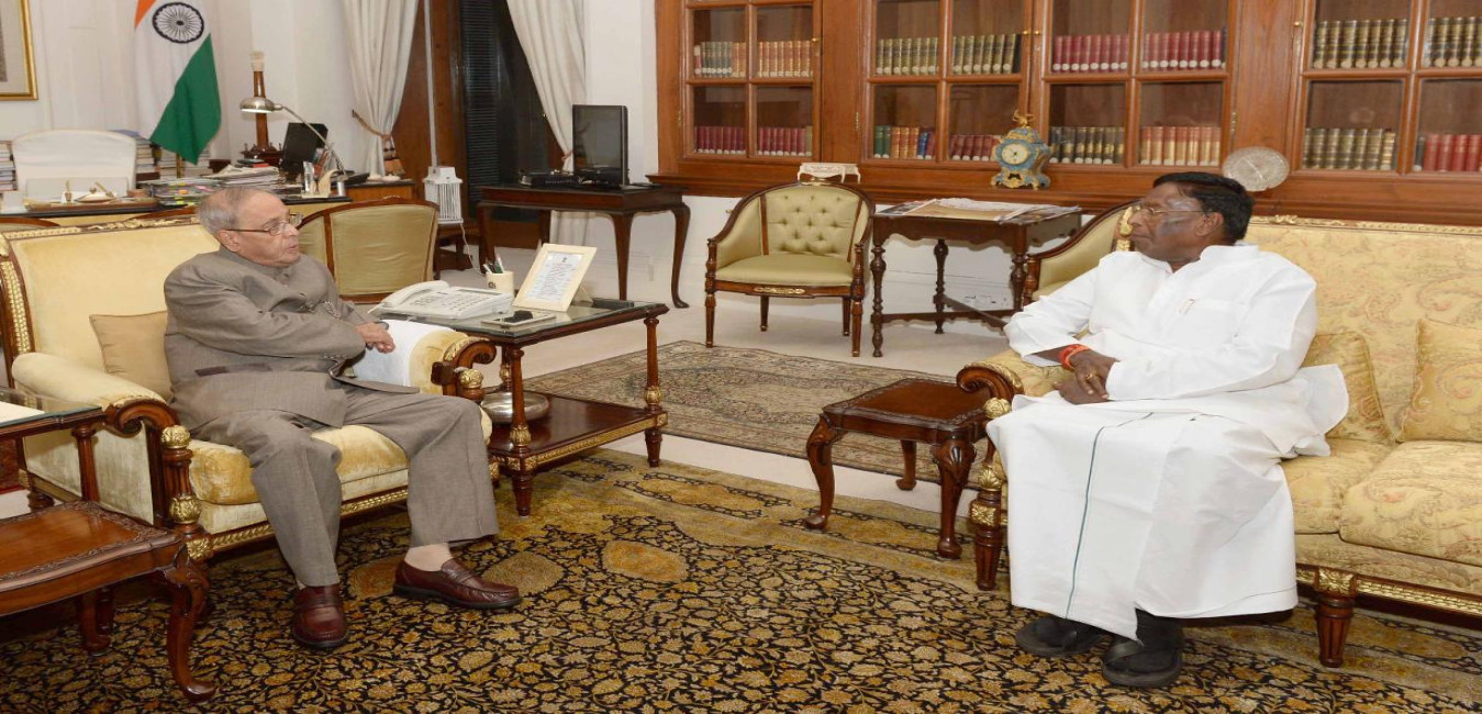 The President of India, Shri Pranab Mukherjee meeting with the Chief Minister of Puducherry, Shri V. Narayanasamy, at Rashtrapati Bhavan on July 20, 2016.