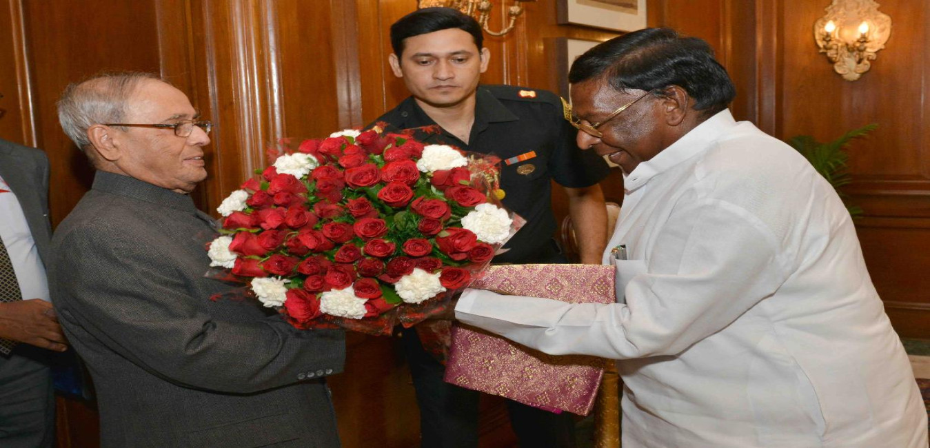The President of India, Shri Pranab Mukherjee meeting with the Chief Minister of Puducherry, Shri V. Narayanasamy, at Rashtrapati Bhavan on October 19, 2016.