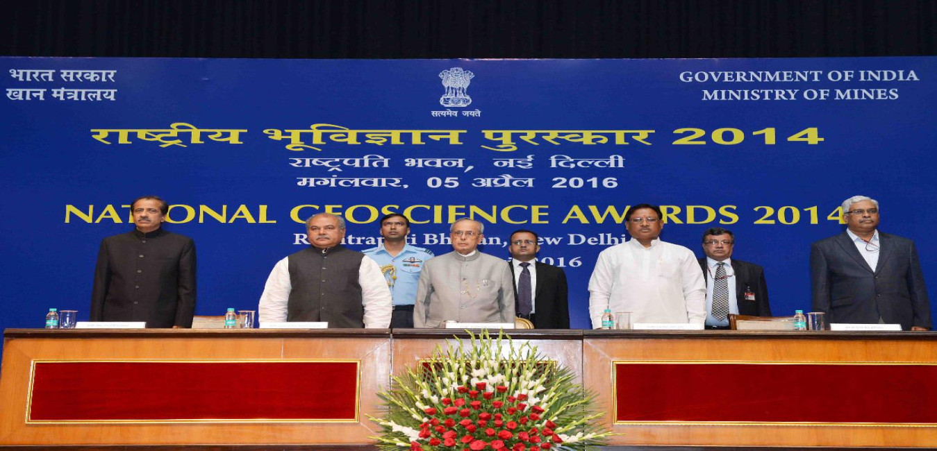 The President of India, Shri Pranab Mukherjee presenting the National Geoscience Awards for the year 2014, at Rashtrapati Bhavan on April 05, 2016.