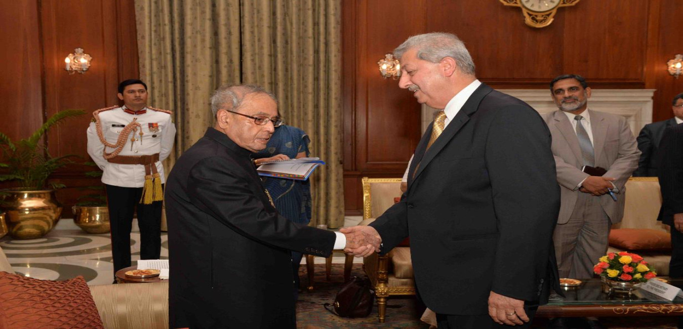 The President of India, Shri Pranab Mukherjee meeting with Shri Mukesh K. Pardeshi, Ambassador designate of India to Mexico, at Rashtrapati Bhavan on April 05, 2016.