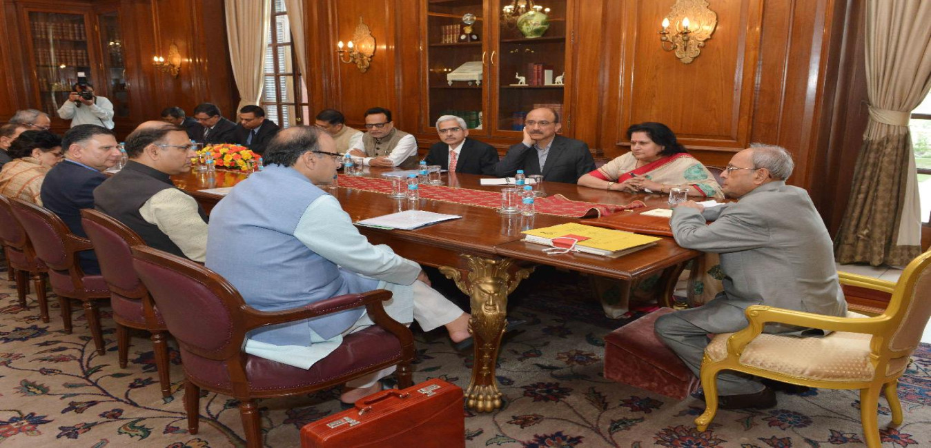 The Union Minister of Finance, Shri Arun Jaitley, the Union Minister of State of Finance, Shri Jayant Sinha along with others presenting the General Budget to the President of India, Shri Pranab Mukherjee, at Rashtrapati Bhavan on February 29, 2016.