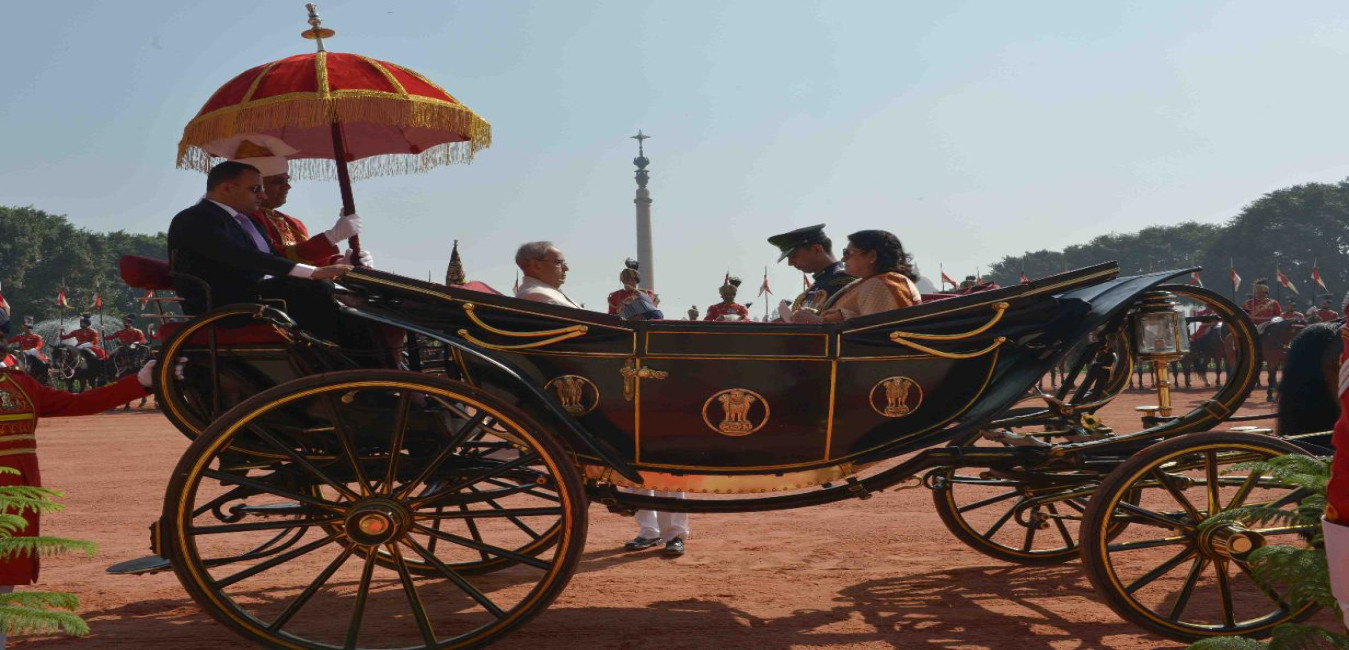 The President of India, Shri Pranab Mukherjee in a Ceremonial Procession towards the Central Hall of Parliament for addressing the Members of both the Houses of Parliament, in New Delhi on February 23, 2016.