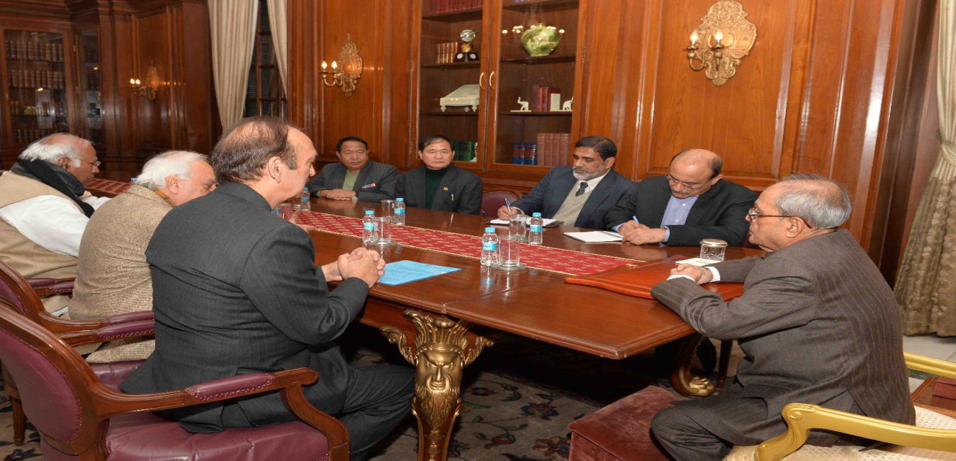 The President of India, Shri Pranab Mukherjee meeting with Shri Mallikarjun Kharge, Leader, Congress Parliamentary Party, Lok Sabha with others, at Rashtrapati Bhavan on January 25, 2016.