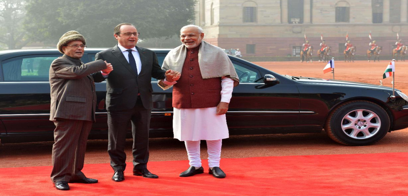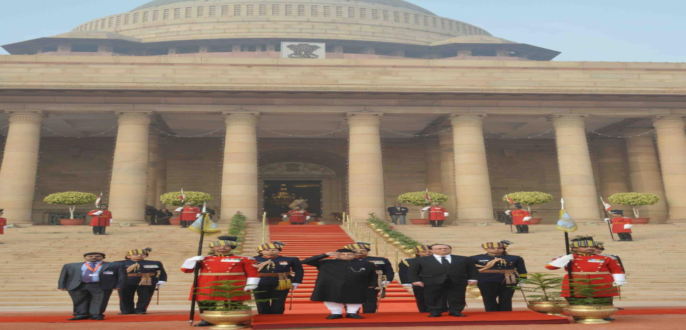 The President of India Shri Pranab Mukherjee receiving the President of the French Republic, H.E. Mr. Francois Hollande during his Ceremonial Reception at the Forecourt of Rashtrapati Bhavan on January 25, 2016.