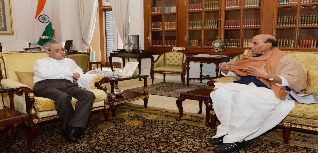 The President of India, Shri Pranab Mukherjee meeting with Shri Rajnath Singh, Minister of Home Affairs, at Rashtrapati Bhavan on January 25, 2016.