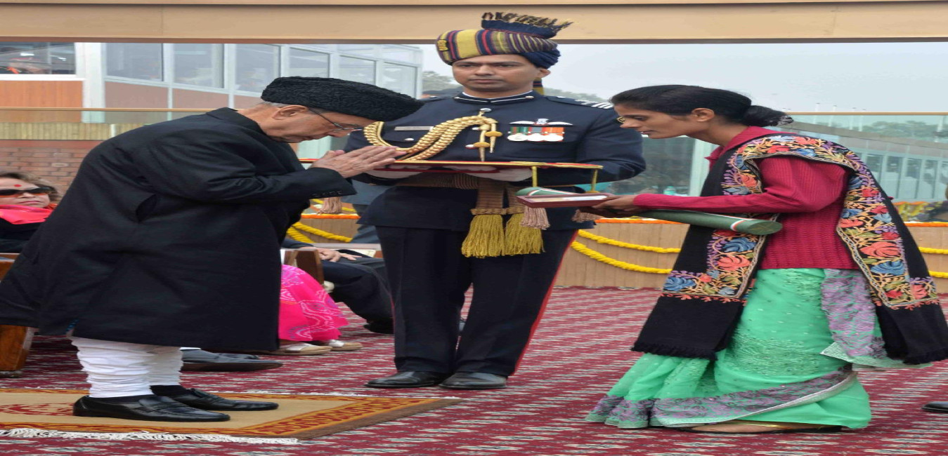 The President of India, Shri Pranab Mukherjee conferring the Ashoka Chakra (the highest peacetime gallantry award) posthumously on Lance Naik Mohan Nath Goswami of 9 Para (Special Forces) at the 67th Republic Day Parade in New Delhi on January 26, 2016. The award is being received by his Wife.