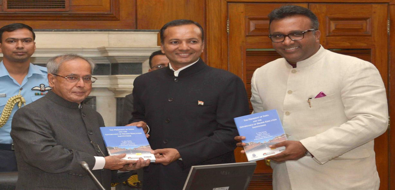 The President of India, Shri Pranab Mukherjee receiving the copy of a book The President of India and the Governance of Higher Education Institutions from the Founding Chancellor Mr. Naveen Jindal and Founding Vice Chancellor, Professor (Dr.) C. Raj Kumar of O.P. Jindal Global University at Rashtrapati Bhavan on November 02, 2015.