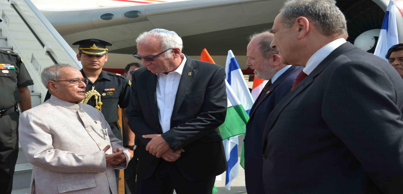 The President of India, Shri Pranab Mukherjee being received by the Minister for Agriculture of Israel, Mr. Uri Ariel, the Ambassador of India to Israel, Shri Jaideep Sarkar and other dignitaries, on his arrival, at Ben Gurion International airport, Tel Aviv, in Israel on October 13, 2015.