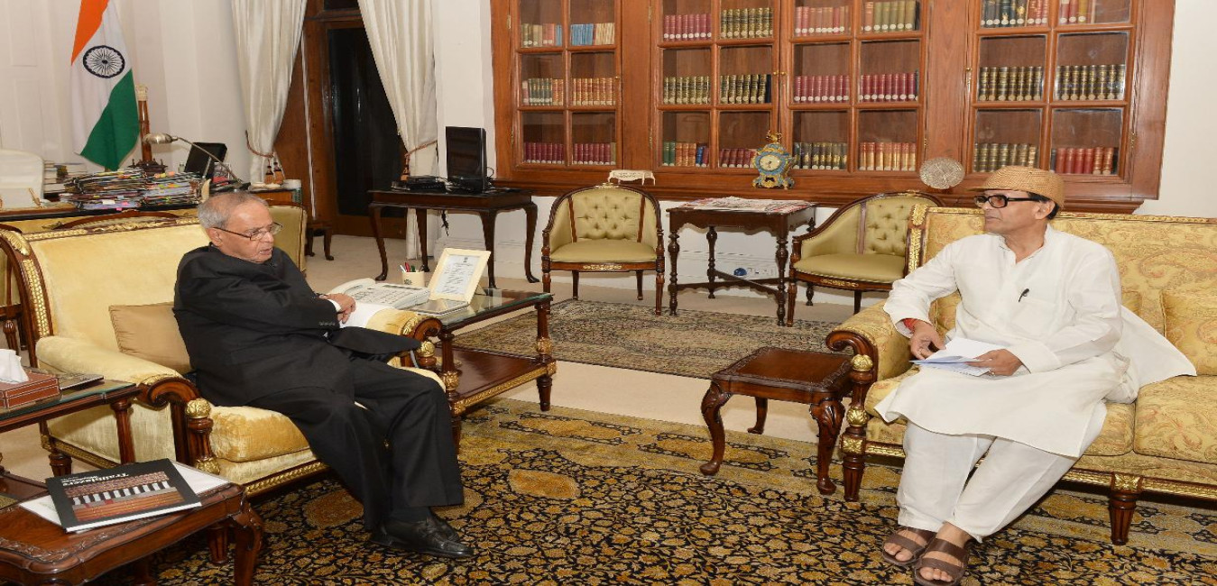 The President of India, Shri Pranab Mukherjee meeting with Shri Bhubaneswar Kalita, MP (RS), at Rashtrapati Bhavan, in New Delhi on September 01, 2015.